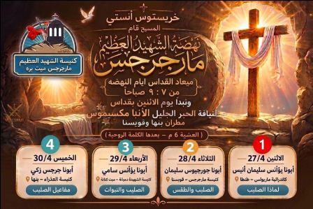 فى إطار إحتفال الكنيسة القبطية بعيد استشهاد أمير الشهداء مارجرجس يوم الجمعة المقبل 1 مايو 2026 “م” الموافق 23 برمودة “ش” تقيم كنيسة أمير الشهداء مارجرجس بـ”ميت بره” التابعة لإيبارشية بنها وقويسنا برئاسة نيافة الأنبا مكسيموس مطران بنها وقويسنا نهضة روحية لشفيعها وذلك في الفترة من 27 / 4 / 2026 وحتى 30 / 4 / 2026.