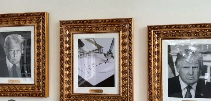 وظهر الجدار الجديد، الملقب بـ«Presidential Walk of Fame»، وهو عبارة عن صف من الصور الرئاسية الماضية، حيث غُيب تمامًا وجه بايدن وحُلّ محله العدد من الرمزية التي تحمل دلالة سياسية، حسبما رصد موقع اكسيوس الأمريكي