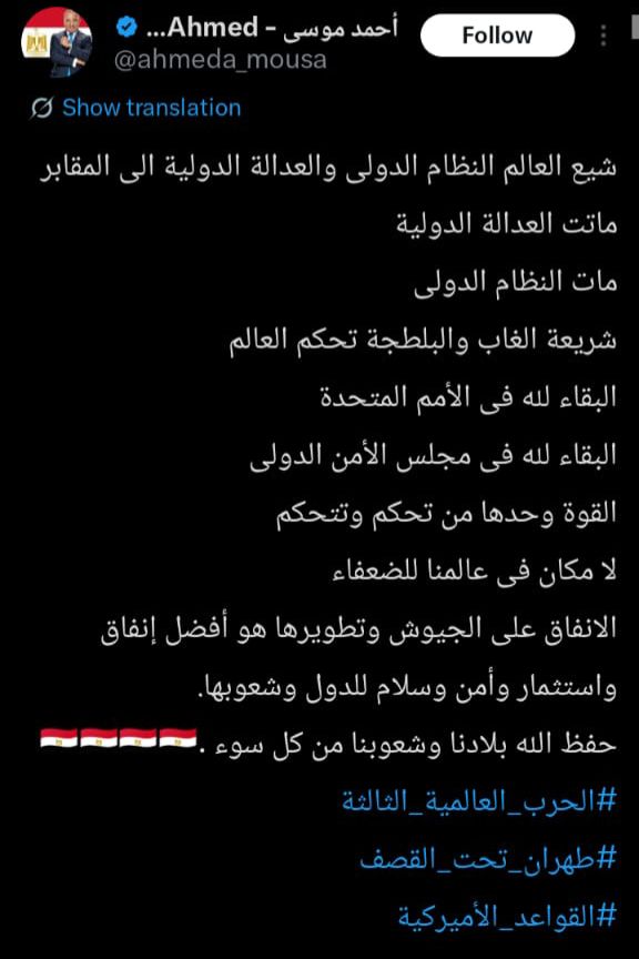 وكتب أحمد موسى عبر حسابه على إكس: "شيع العالم النظام الدولى والعدالة الدولية الى المقابر، ماتت العدالة الدولية، مات النظام الدولى، شريعة الغاب والبلطجة تحكم العالم، البقاء لله فى الأمم المتحدة، البقاء لله فى مجلس الأمن الدولى، القوة وحدها من تحكم وتتحكم، لا مكان فى عالمنا للضعفاء، الانفاق على الجيوش وتطويرها هو أفضل إنفاق واستثمار وأمن وسلام للدول وشعوبها. حفظ الله بلادنا وشعوبنا من كل سوء".