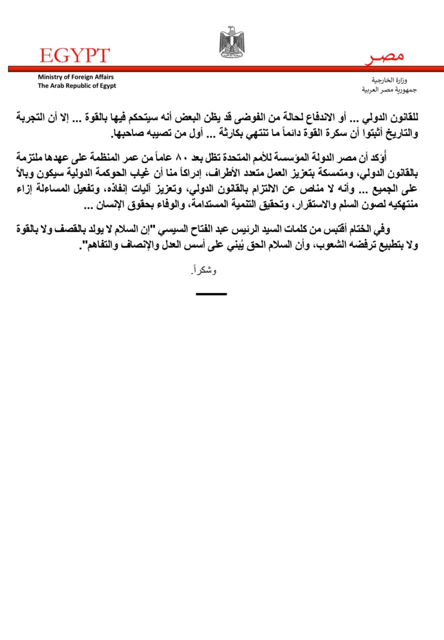 كما أكد الدكتور بدر عبد العاطي وزير الخارجية والهجرة، ضرورة بناء نظام عالمي يتأسس على قواعد القانون الدولي.