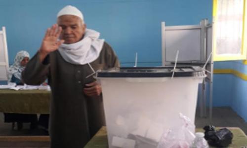 حرص عمر عبدالعزيز، البالغ عمره 84 عامًا، على الإدلاء بصوته في الاستفتاء على التعديلات الدستورية بمدرسة أسوان التجريبية الحديثة.