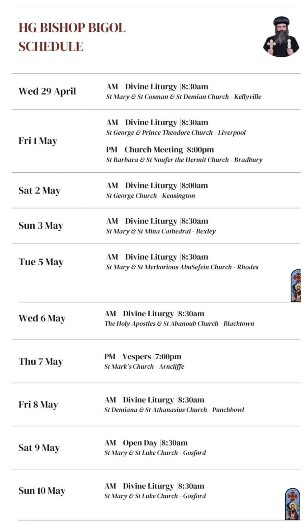 وصل مساء اليوم الإثنين الموافق 27 إبريل مطار سيدني الداخلي بأستراليا ، نيافة الحبر الجليل الأنبا بيجول أسقف ورئيس دير القديسة العذراء مريم العامر ” المحرق ” بمحافظة أسيوط ، قادماً من مدينة ملبورن وذلك ضمن زيارته الرعوية للقارة الأسترالية ، وكان في استقباله عدد من أبناء الكنيسة القبطية يتقدمهم نيافة الأنبا دانييل أسقف إيبارشية سيدني وتوابعها ، وقد أعدت الإيبارشية برنامج لزيارة الحبر الجليل الأنبا بيجول التى تستمر لمدة 10 أيام يلتقى فيها كهنة وشعب كنائس الإيبارشية ضمن الجدول المرفق .
