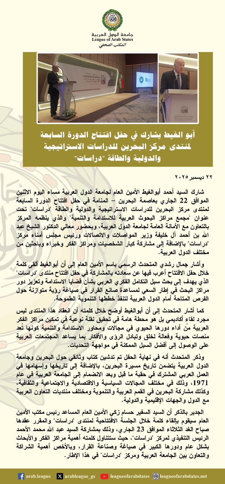 شارك أحمد أبو الغيط الأمين العام لجامعة الدول العربية مساء اليوم الإثنين في حفل افتتاح الدورة السابعة لمنتدى مركز البحرين للدراسات الاستراتيجية والدولية والطاقة “دراسات” والتي تعقد تحت عنوان "مجتمع مراكز البحوث العربية للاستدامة والتنمية"  بالعاصمة البحرينية – المنامة.
