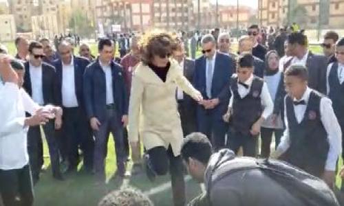 فيديو.. وزيرة الهجرة نبيلة مكرم تشارك طلاب الفيوم لعبة "نط الحبل"