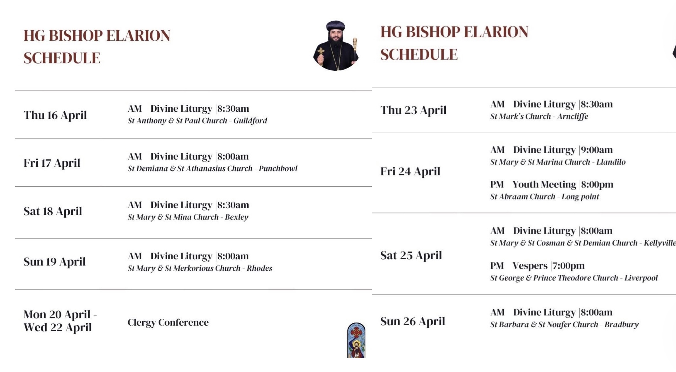 وقد أعدت الإيبارشية برنامج لزيارة الأنبا إيلاريون يزور خلالها عدد من كنائس مدينة سيدني ، كما يشارك مؤتمر كهنة الإيبارشية المقرر انعقاده من الإثنين المقبل 20 ابريل إلى الأربعاء 22 إبريل , وقيادة اجتماع الشباب مساء الجمعة القادم الموافق 24 إبريل طبقاً للجدول المرفق .