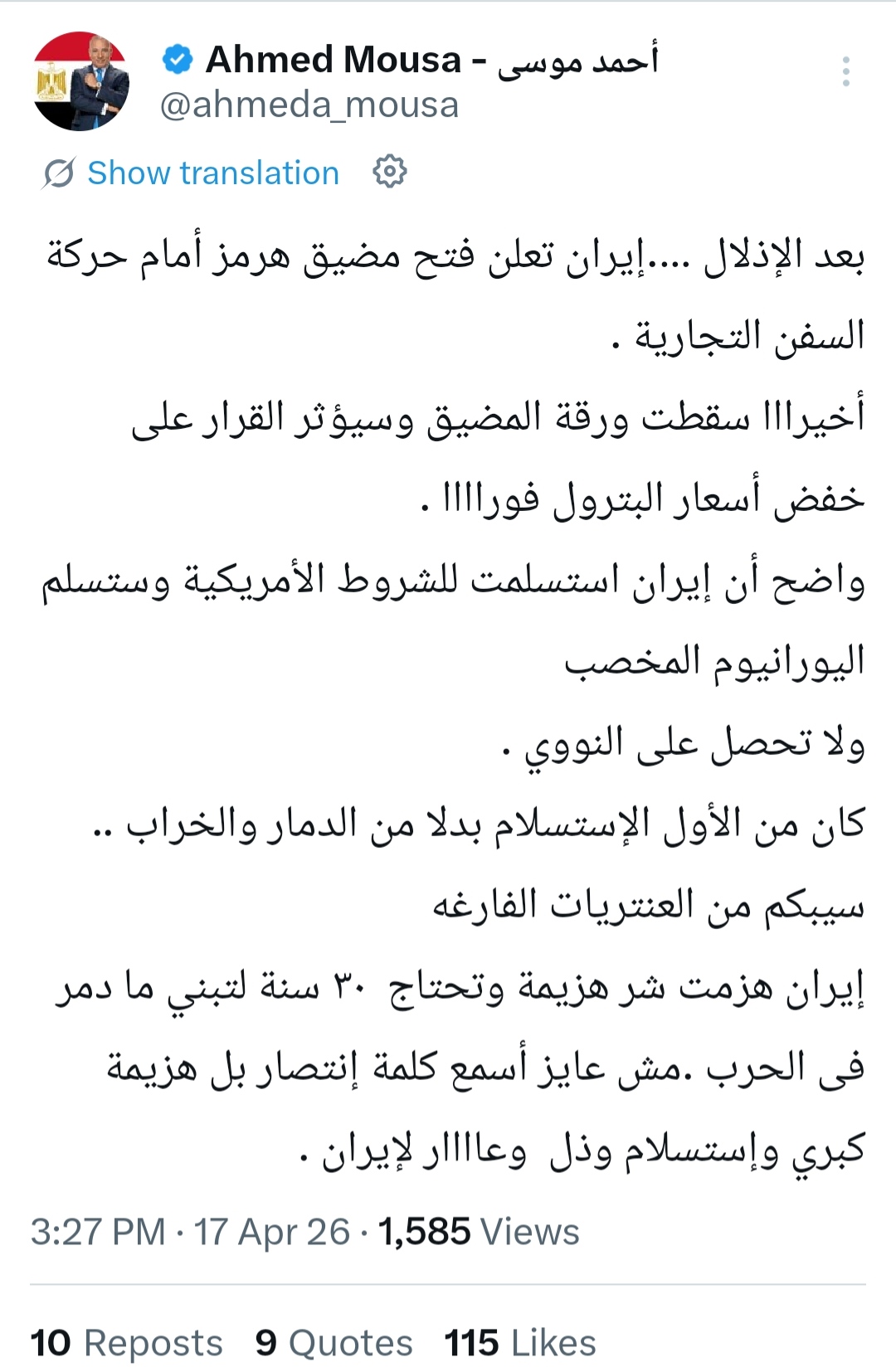 وكتب أحمد موسي عبر حسابه بموقع أكس:بعد الإذلال إيران تعلن فتح مضيق هرمز أمام حركة السفن التجارية .